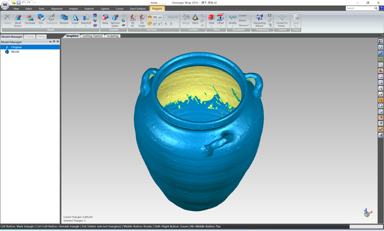 The number of triangles of model can be viewed at the bottom of the software interface. In this example, the original model has about 6 million polygons. For a general computer configuration, direct operation will be very laggy and affect work efficiency. Therefore, the model needs to be decimated:
